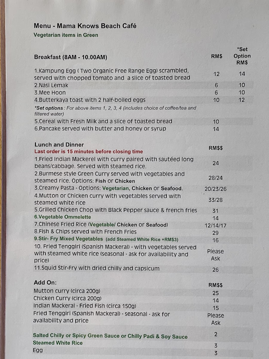 The menu at Mama Knows @ Fedelia Beach Garden Cafe offers a variety of food and beverage options suitable for casual dining occasions. Visitors can expect a selection that includes main dishes with a focus on curries such as mutton and Burmese green curry, as well as fresh seafood options like squid. The offerings cater to lunch and dinner meals, providing hearty and flavorful choices.